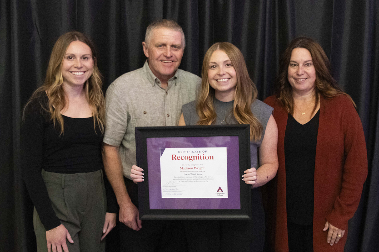 The Assiniboine College Alumni Association is proud to introduce the recipients of its annual Parkland region alumni awards. The One to Watch award recipients were Blessing Chukwunonso and Bryn Thiele. The Distinguished Alumni award went to Phyllis Racette, and the Excellence in Education Award went to Kristy Desender.